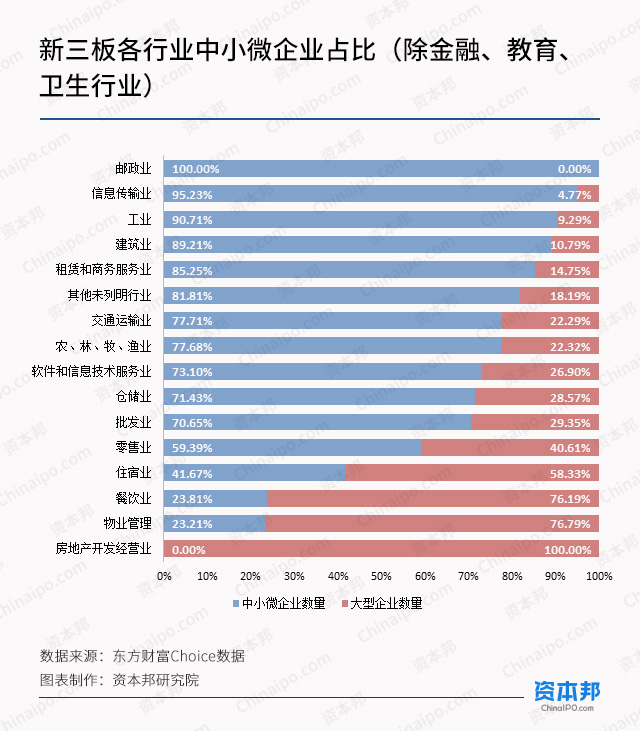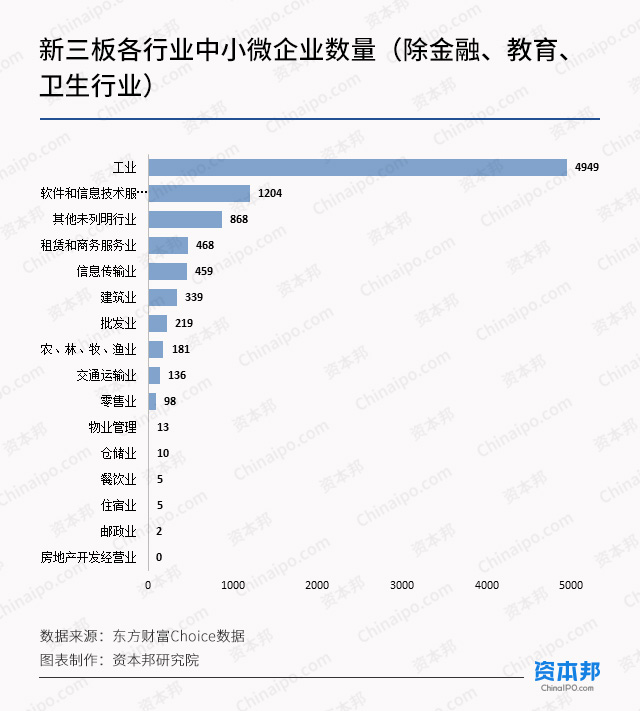 根据国家统计局发布的《统计上大中小微型企业划分办法》,资本邦研究院对新三板公司按照行业进行了分类,并严格按照《办法》的标准筛选出了各行业内的中小微企业进行分析。