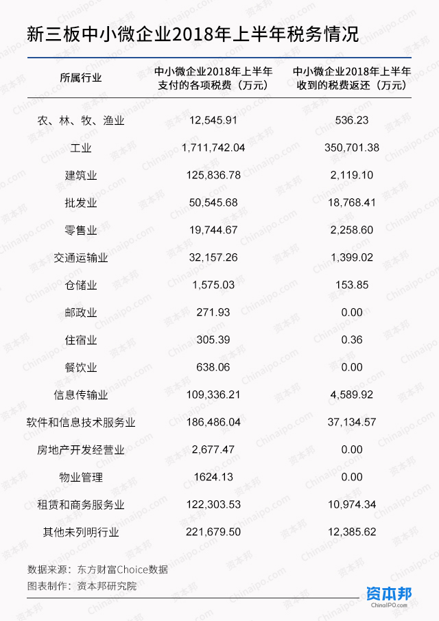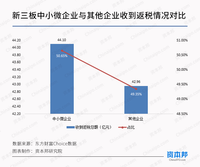 从统计数据来看,扣除教育、金融、卫生、铁路运输、自有房地产经营等行业外,新三板上剩余10564家公司中有8956家公司属于中小微企业,占到了84.78%,是新三板市场的主要力量。此次国税局下发的《通知》对新三板市场的未来发展起到了至关重要的作用,新三板中小微企业2018年上半年共缴税259.94亿元,占新三板公司缴税总额的49.71%;共收到返税44.10亿元,占新三板公司返税总额的50.65%。